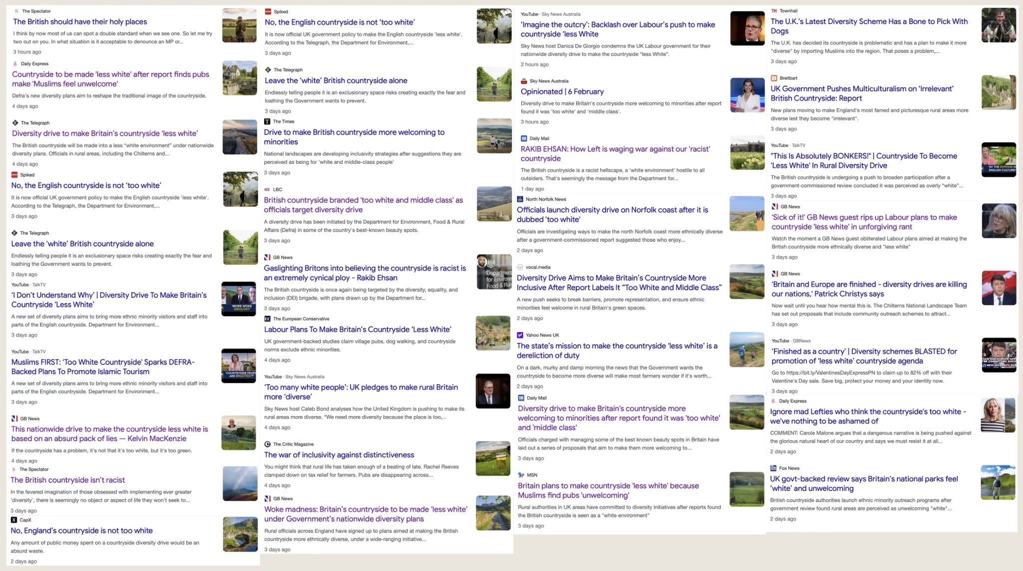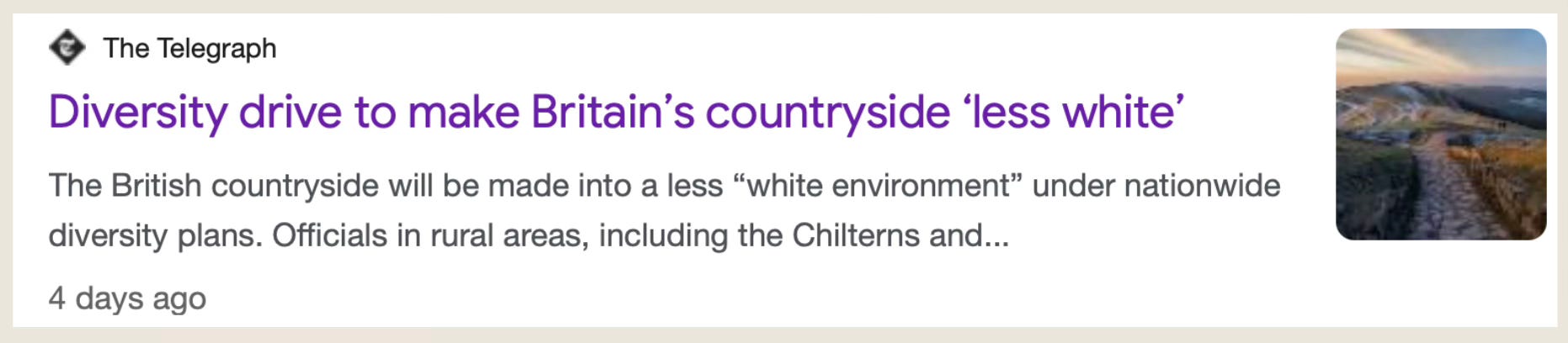 Sensible, fairly dry reports, written several years ago, suggest that some groups are facing barriers to accessing nature and that maybe we could try to make those spaces feel more accessible. The Telegraph decides to dig them out and write a deliberately provocative article about diversity, and 35 right-wing media pieces are produced over 4 days, yelling “stop calling us racist” alongside “we like our white countryside”.