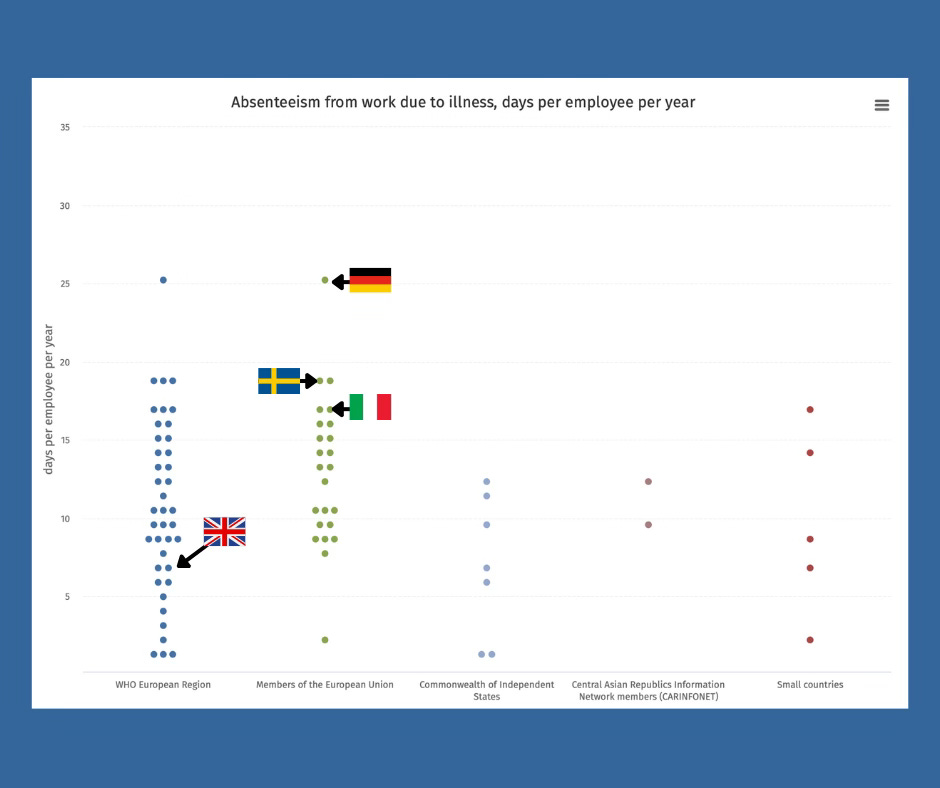 The World Health Organisation collates data on “Absenteeism from work due to illness, days per employee per year”, and while the UK data is a few years out of date, you can see where we sit in the wider context of Europe. Even at the 9.4 days suggested by the CIPD report, we sit pretty centrally compared to the rest of Europe.