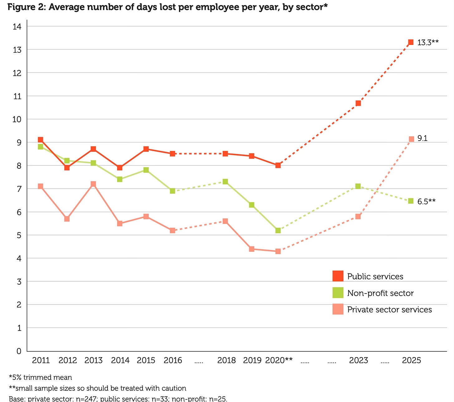 Yes, the CIPD data shows that public sector sickness days are higher than in the private sector (13.3 days vs 9.1 days).
